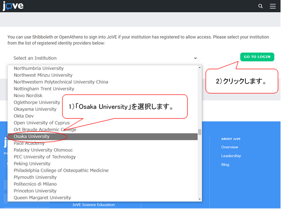 "Select an Institution"から「Osaka University」を選択し、「GO TO LOGIN」をクリックします。