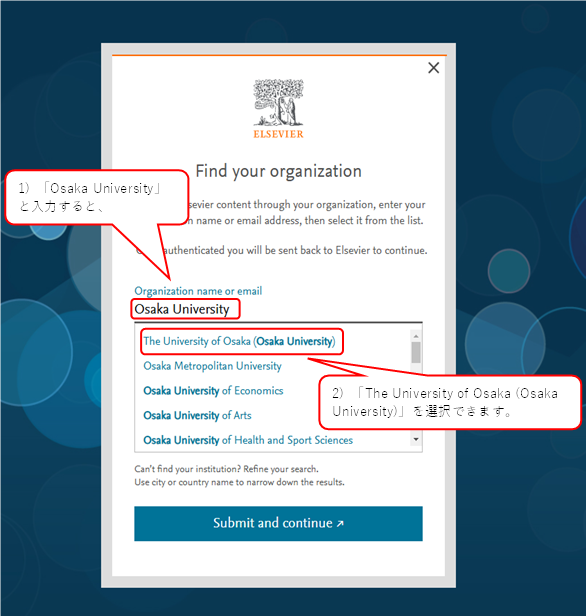 1)「Organization name or email」に「Osaka University」と入力すると、