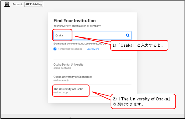 「Osaka」と入力し、選択画面から「The University of Osaka」をクリックします。