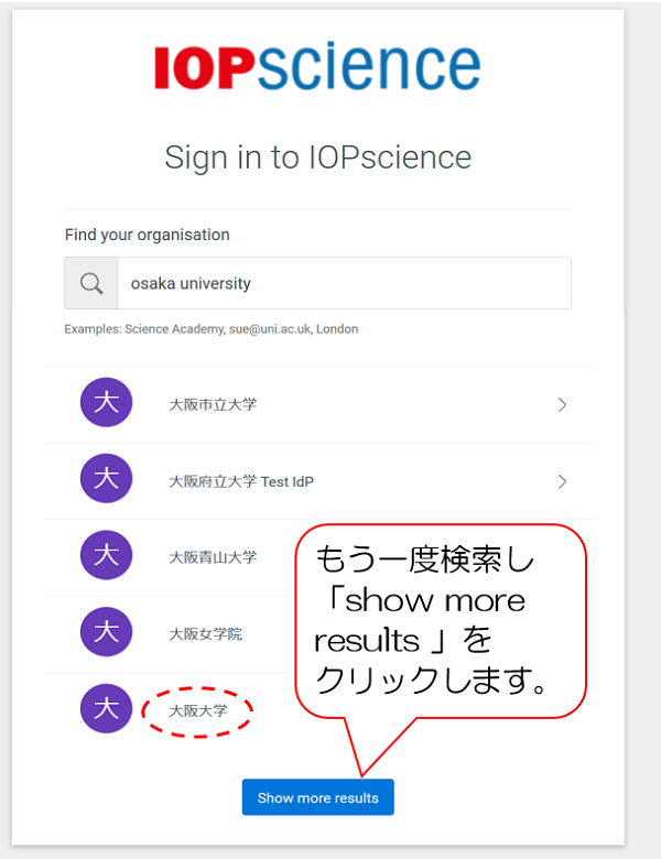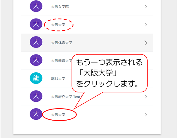 「Osaka University」または「大阪大学」と入力し、「大阪大学」をクリックします。