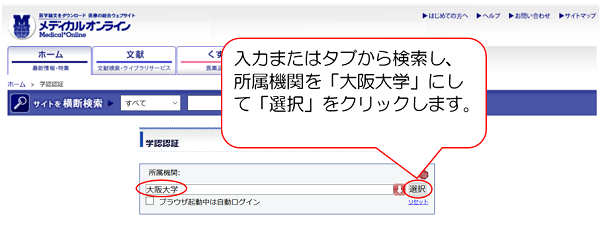 プルダウンから選択、または入力して所属機関を「大阪大学」にし、「選択」をクリックします。