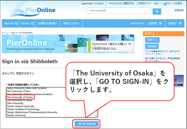 表示される組織の中から「The University of Osaka」を選択し、