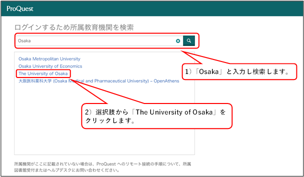 機関名に「Osaka」と入力して検索し、選択肢から「The」University of Osaka」をクリックします。