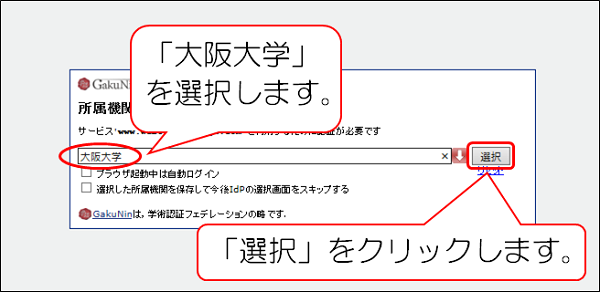 プルダウンメニューから「大阪大学」を選択し、「選択」をクリックします。