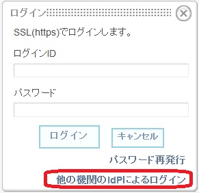 ログインのポップアップ画面が表示されますので、「他の機関のIdPによるログイン」をクリックします。