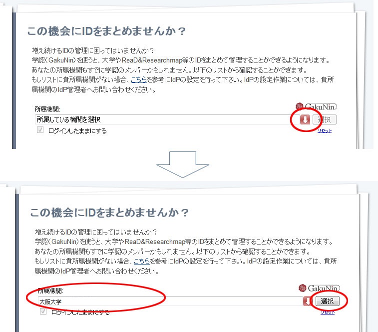 「この機会にIDをまとめませんか?」の画面が表示されますので、プルダウンで大阪大学を選び、「選択」をクリックします。