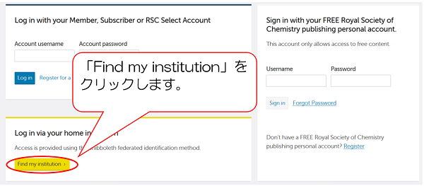 「Log in via your home institution」の「Find my institution」をクリックします。