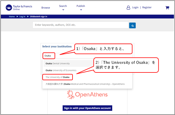 「Osaka」と入力すると、「The University of Osaka」を選択できます。