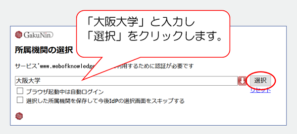 「所属機関の選択」で「大阪大学」を入力し、「選択」をクリックします。